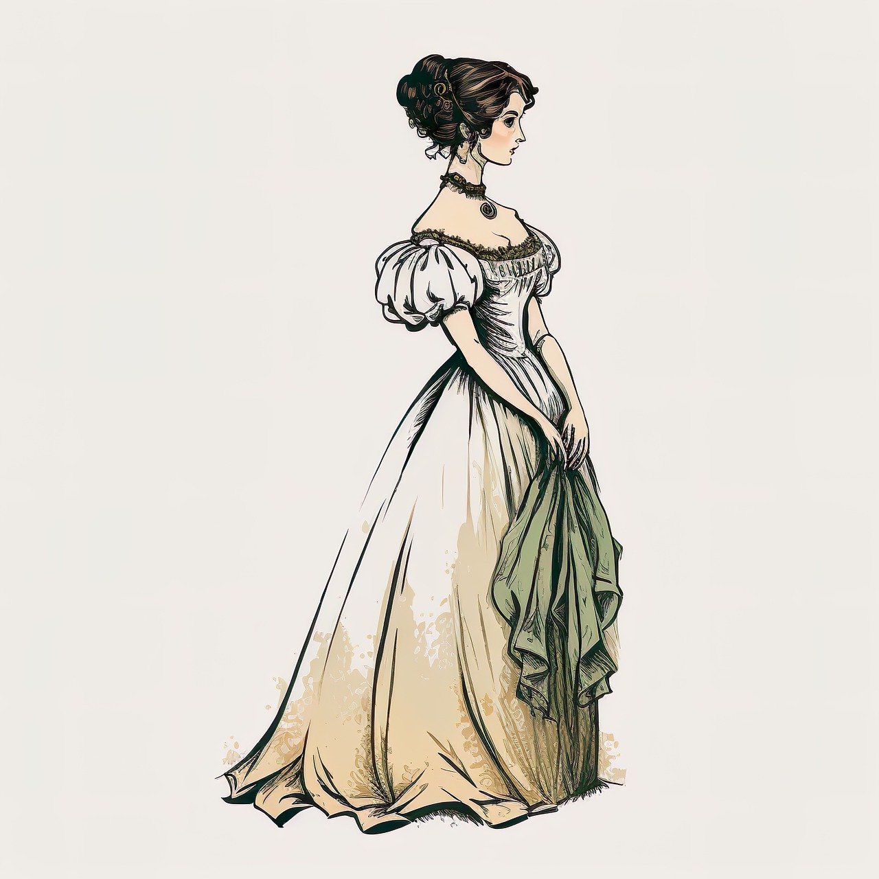 먼저, 엠파이어 스타일 복식의 여성 드레스는 특징적인 실루엣을 가지고 있습니다. 이 드레스는 허리를 강조하지 않고 대신에 가슴 부분을 강조하는 고탑 웨이스트라인을 가지고 있습니다. 슬림한 실루엣은 여성의 몸을 길고 아름답게 보이게 합니다. 또한, 넓은 스커트와 풍부한 주름이 특징적이며, 고전적인 그리스 로마 시대의 영감을 받았습니다.